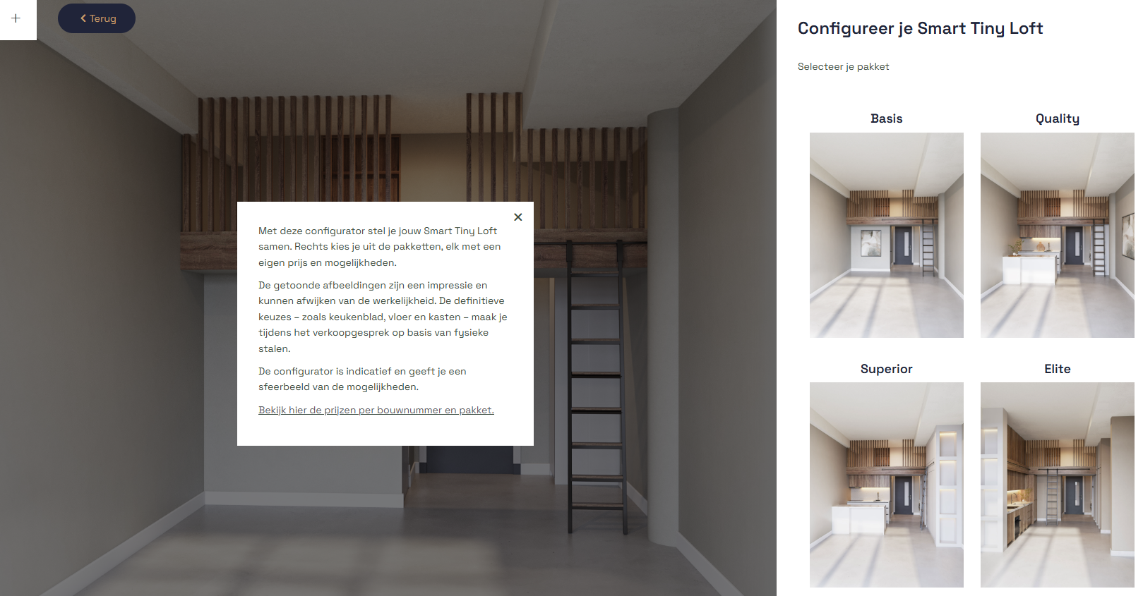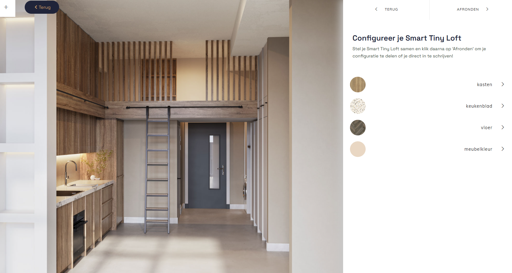 Via de configurator stel je zelf je woning samen. Zo is het mogelijk om te kiezen uit diverse inbouwmeubelpakketten en de verschillende materiaal- en kleurkeuzes te selecteren.